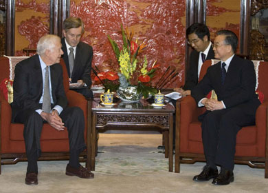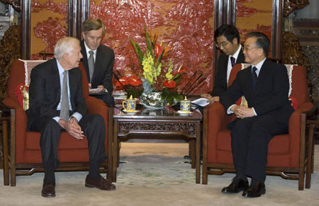 "The establishment of China-U.S. relations 30 years ago ushered in a new era. The leaders and people of the two nations who made important contributions to this milestone will go down in history, " Wen told former U.S. President Jimmy Carter, who led the delegation. Carter said it was a great honor and pleasure to represent one of the administrations that worked to establish the diplomatic relations and come to Beijing for anniversary celebrations. Thanks to the "ping-pong diplomacy" that melted the ice between the nations, then U.S. President Richard Nixon paid a groundbreaking visit to China in 1972. The two countries formally established diplomatic relations on January 1, 1979 when Carter was president of the United States. "I visited China as a young man when I was in the navy. I always think my life, my destiny are very close to China," Carter said. He said even before he was inaugurated as president, he discussed with Zbigniew Brzezinski that normalizing relations with China was his "top priority." The U.S. delegation to the Beijing celebrations included key figures in forging relations such as former U.S. Secretary of State Henry Kissinger, National Security Advisors Brent Scowcroft and Zbigniew Brzezinski and former U.S. ambassadors. In an hour-long meeting with the delegation, Wen said China-U.S. relations had produced fruitful results over the past three decades. "The most important is that we agreed on the general direction of building constructive cooperation," Wen said. Wen said the two nations established a series of effective dialogues and mechanisms, developed cooperation in politics, economy, culture and other fields, which cemented the basis of public opinions and interests to develop the bilateral ties and step up the confidence and courage to conquer the difficulties. "These are our shared treasures and the source of strength for further cooperation," Wen said. Wen said the current international political and economic situations were complicated and volatile. "China-U.S. relations stay at a crucial time connecting the past and the future, facing tremendous opportunities and challenges," Wen said. Wen proposed the two nations take a strategic and long-term perspective, and not waver in developing a constructive partnership. "Particularly in responding to the international financial difficulties, the two nations should step up mutual trust and cooperation, jointly tackle difficulties, take the relations to a new high and make new contributions for the world's harmonious and sustainable development." In response, Carter proposed the two countries understand and respect each other, step up dialogues to deal with global challenges, enhance the constructive cooperation. He also pledged to continuously commit himself to promoting U.S.-China cooperation. ![]() ![]() ![]() |