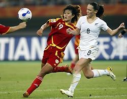 China launched repeated attacks but wasn't able to crack the gritty New Zealand defense until the 57th minute when Li Jie scored off a free kick from Zhou Gaoping, heading the ball over keeper Jenny Bindon. Xie added another in the 79th minute, deftly outdribbling a defender and launching a left-footed shot from close range. Like in its other first-round games against Group D opponents Brazil and Denmark, the underdog New Zealand squad's scrappy defense held off repeated scoring drives. China outshot New Zealand 22-5. Zhang Ouying's shot 50 seconds into the game was deflected out of bounds by keeper Jenny Bindon, and was followed by numerous other misses. Near the end of the period, Han Duan outdribbled several defenders but her shot from six meters (yards) veered just out bounds. Han's header in the 75th was batted over the goal by Bindon, followed by a shot a minute later from Ma Xiaoxu that hit the crossbar. New Zealand went home losing all three of its first round games, without ever scoring a goal. It best chance to score in the game came in the 64th minute, when Zoe Thompson charged at China goalie Zhang Yanru one-on-one, but her shot went wide. Zhang started in goal instead of Han Wenxia, whose mistakes in China's last game against Brazil contributed to a 4-0 rout. A boisterous crowd of 56,200 turned out at Tianjin Olympic Center Stadium to cheer on the home team, setting off flares and chanting "Two to nothing!" after China's first goal. |