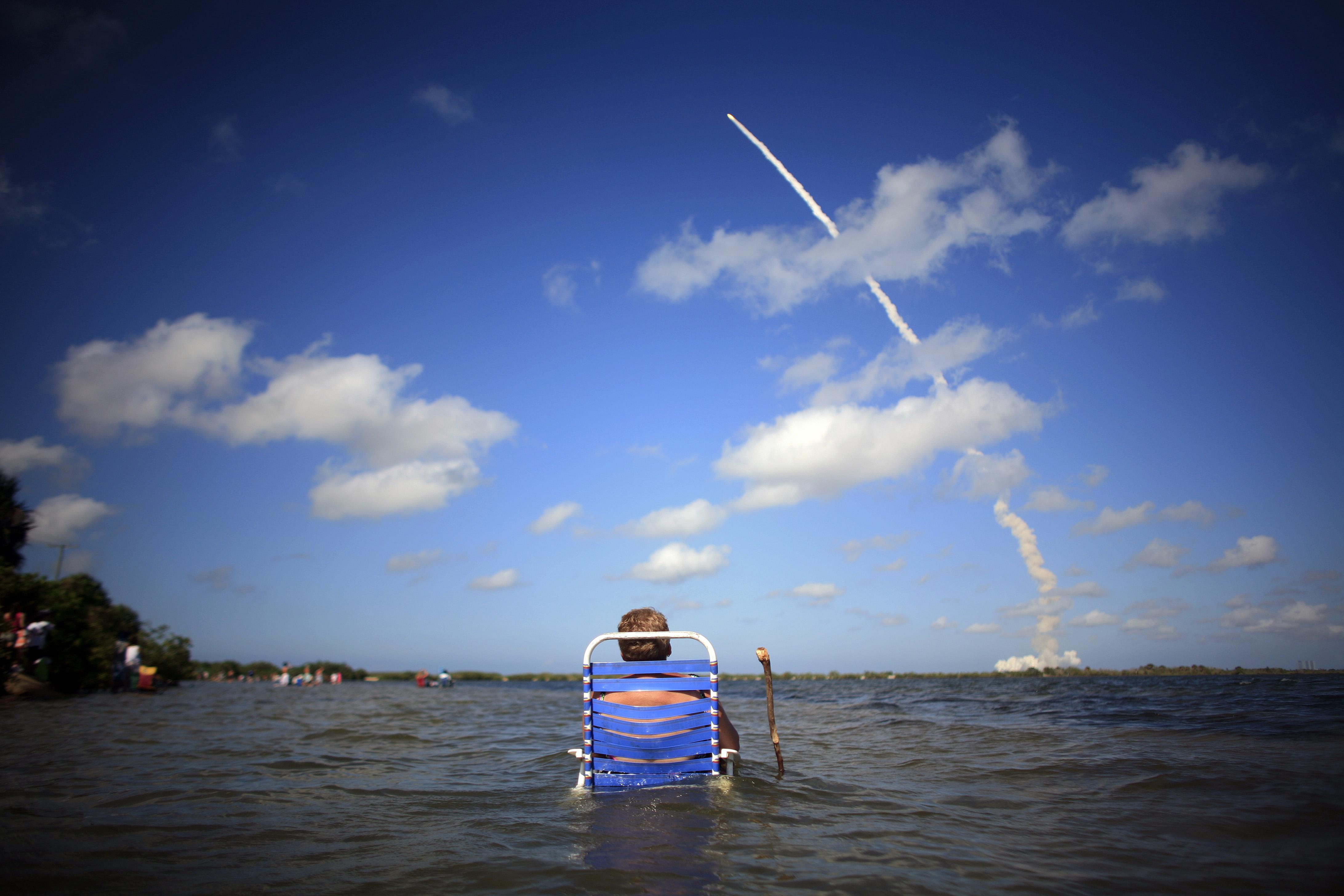 | A woman watches from Titusville, Florida as the space shuttle Discovery launches from pad 39A at the Kennedy Space Center in Cape Canaveral, Florida May 31, 2008. [Agencies] |
