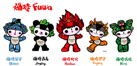 Like the Five Olympic Rings from which they draw their color and inspiration, the Five Friendlies will serve as the Official Mascots of Beijing 2008 Olympic Games, carrying a message of friendship and peace--and blessings from China--to children all over the world. Designed to express the playful qualities of five little children who form an intimate circle of friends, the Five Friendlies also embody the natural characteristics of four of China's most popular animals--the Fish, the Panda, the Tibetan Antelope, the Swallow--and the Olympic Flame. In China's traditional culture and art, the fish and water designs are symbols of prosperity and harvest. And so Beibei carries the blessing of prosperity. A fish is also a symbol of surplus in Chinese culture, another measure of a good year and a good life. The ornamental lines of the water-wave designs are taken from well-known Chinese paintings of the past. Among the Five Friendlies, Beibei is known to be gentle and pure. Strong in water sports, she reflects the blue Olympic ring. Each of the Friendlies has a rhyming two-syllable name--a traditional way of expressing affection for children in China. Beibei is the Fish, Jingjing is the Panda, Huanhuan is the Olympic Flame, Yingying is the Tibetan Antelope and Nini is the Swallow. When you put their names together--Bei Jing Huan Ying Ni--they say "Welcome to Beijing," offering a warm invitation that reflects the mission of the Five Friendlies as young ambassadors for the Olympic Games. The Five Friendlies also embody both the landscape and the dreams and aspirations of people from every part of the vast country of China. In their origins and their headpieces, you can see the five elements of nature--the sea, forest, fire, earth and sky--all stylistic rendered in ways that represent the deep traditional influences of Chinese folk art and ornamentation. Spreading Traditional Chinese Blessings Wherever They Go In the ancient culture of China, there is a grand tradition of spreading blessings through signs and symbols. Each of the Five Friendlies symbolizes a different blessing--and will honor this tradition by carrying their blessings to the children of the world. Prosperity, happiness, passion, health and good luck will be spread to every continent as the Five Friendlies carry their invitation to Beijing 2008 to every part of the globe. At the heart of their mission--and through all of their work--the Five