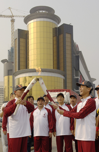 of the flame in front of the Sands Hotel in Macau October 26, 2006. The relay is