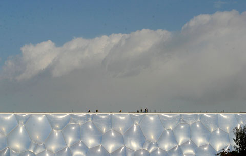 Workers work atop of the National Aquatic Center, nicknamed the "Water
