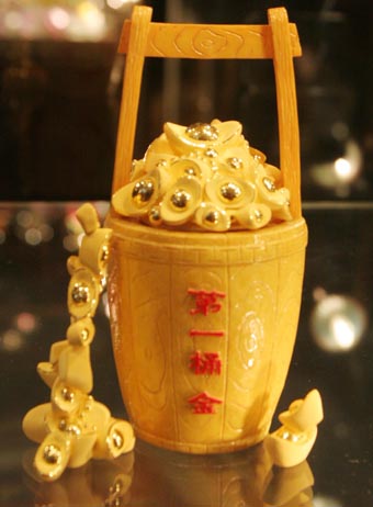 This 'bucket of gold', made entirely of gold, was on display at the China International Jewelry Exhibition on November 8, 2006. The exhibition was the first to be held at the China International Exhibition Centre in Beijing. [newsphoto]