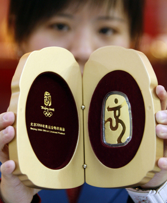 A salesperson shows a gold tablet embossed with the Beijing Olympic symbol,