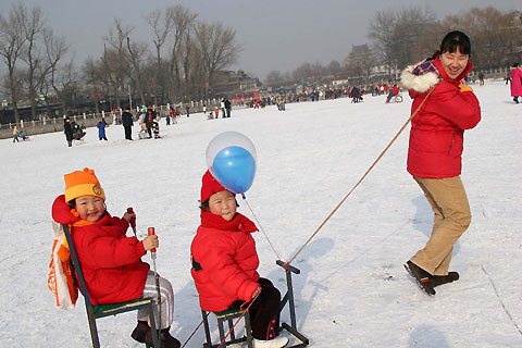 Beijingers frolic on freezed lake surface at the Shi Cha Hai Park on January 1, 2007. [newsphoto]