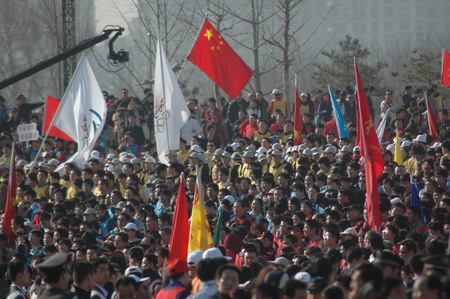 Beijing International Long Walk Carnival to mark the 500-day countdown to the Olympic Games--Volunteers display a huge Olympic flag in Beijing, March 25, 2007.
