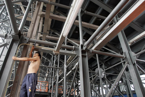 A labourer paints steel frames at the venue for the 2008 Olympics beach volleyball competition at Chaoyang park in Beijing July 26, 2007. Chinese Premier Wen Jiabao has urged developers of 2008 Beijing Olympics stadiums to be energy-efficient and frugal during construction, Xinhua reported. [Reuters]