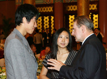 | Olympic 110-meter hurdle champion Liu Xiang (L) listens to IOC