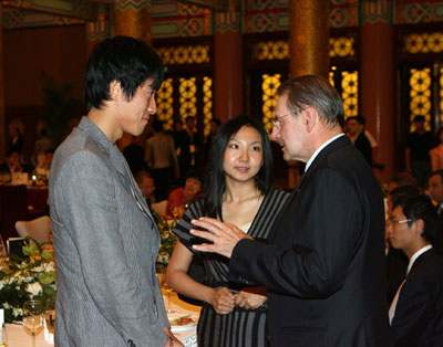 President of the International Olympic Committee Jacques Rogge (R) talks with China's Olympic 110m hurdles champion Liu Xiang at a dinner he gave to the official sponsors for the Beijing 2008 Olympics at Beijing Hotel August 7, 2007. [Xinhua]