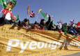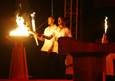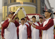 Asian Games volunteers light their torches from the cauldron during the 15th Asian Games torch lighting ceremony at the Doha Golf club in Doha October 8, 2006.[Reuters]