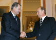 Russia's President Vladimir Putin (R) shakes hands with International Olympic Committee President Jacques Rogge during a meeting in Moscow's Kremlin October 9, 2006. [Reuters]