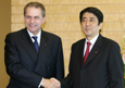 Japan's Prime Minister Shinzo Abe (R) shakes hands with International Olympic Committee (IOC) President Jacques Rogge at the prime minister's official residence in Tokyo October 19, 2006. Rogge is on a four-day visit to Japan. [Reuters]