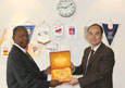 Wang Wei(L) exchange gift with Macome Marcelino, visiting President of the Mozambique Olympic Committee.Wang Wei, executive vice president and secretary-general of the Beijing Organizing Committee for the Games of the XXIX Olympiad (BOCOG) met with Macome Marcelino, visiting President of the Mozambique Olympic Committee and the two sides had a friendly conversation in Beijing October 18,2006.[BOCOG]