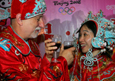 Californian Bridegroom James Linday (L) of US and his bride Zeng Ping from Lintong, central China's Shaanxi Province, pose for a photo holding Fuwa in hand, the Beijing 2008 Olympic mascots on November 5, 2006.The couple were part of the first Olympic wedding ceremony in Xian, capital of Shaanxi to hail the upcoming Beijing 2008 Olympic Games.[newsphoto]