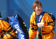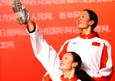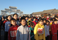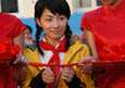 Olympic 10,000-metre gold medallist Xing Huina is greeted by a pupil at the opening ceremony of the Xing Huina Hope Elementary School at Shizixing Village in Weifang, East China's Shandong Province, Thursday, November 9, 2004. The school is funded by the China Sportspersons' Education Fund, which was founded by former Chinese world and Olympic champions. [newsphoto]