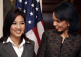 Figure skating champion Michelle Kwan (R) smiles as U.S. Secretary of State Condoleezza Rice speaks at the Treaty Room of the State Department in Washington November 9, 2006. Rice named Kwan the public diplomacy ambassador to represent American values especially to young people and sports enthusiasts. [Reuters]