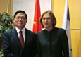 China's Commerce Minister Bo Xilai (R) reacts while being presented with a 2010 Vancouver Olympic Winter Games jacket by Canada's International Trade Minister David Emerson before the start of a meeting in Ottawa May 28, 2007.