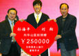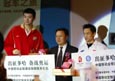 Olympic champion 110m hurdler Liu Xiang(C) and his coach (R) Sun Haiping hold a donation tablet for Shanghai-based Huashan Hospital December 25,2006. The champion and his coach are reported to have donated 250,000 yuan to the hospital in his hometown Shanghai to help treat elderly people suffering from cataract, Xinhua New Agency reports.[Xinhua]