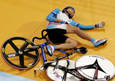 Japan's Kazuhiro Mori crashes during the men's track cycling madison finals at the 15th Asian Games in Doha December 14, 2006. South Korea won the gold medal, ahead of Kazakhstan and Iran. [Reuters]