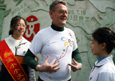 Visiting Doctor Norbert Muller (center), member of International Olympic Committee (IOC puts on a T-shirt with the theme of Olympics made by students of the Beijing No 161 Middle School March 29, 2007. [newsphoto]
