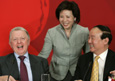 Chief International Olympic Committee (IOC) inspector Hein Verbruggen (L), executive vice president of Beijing organising committee (BOCOG) Jiang Xiaoyu (R) and Wang Hui,the deputy director general of the media and communications department of BOCOG talk after a news conference in Beijing April 19, 2007. Beijing organisers still believe a solution is possible to the problem of taking the 2008 Beijing Olympic torch relay to Taiwan, an official said on Thursday. [Reuters]