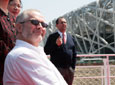 International Olympic Committee (IOC) President Jacques Rogge (C) and president of the Beijing Organizing Committee for the Olympic Games Liu Qiu (L) visit the site of the Beijing 2008 Olympic Games main stadium October 24, 2006. [Reuters]
