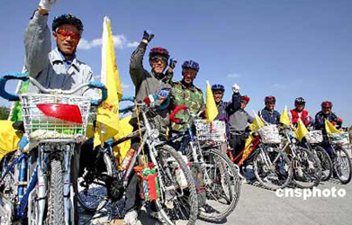 Eight senior citizens from Hami, Xinjiang Uygur Autonomous Region arrived at Urumchi by bike after 7 days cycling journey on May 29. They plan to finish a more than 2,000-kilometer long cycling trip around Xinjiang within 40 days to promote 2008 Beijing Olympic Games.[cnsphoto]