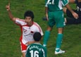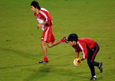 Manchester United's Dong Fangzhou (R) comes on for Alan Smith (C) during a celebration soccer match against an Europe XI to mark the 50th anniversary of Manchester United appearing in European competition , at Old Trafford in Manchester, northern England March 13, 2007. [Reuters]
