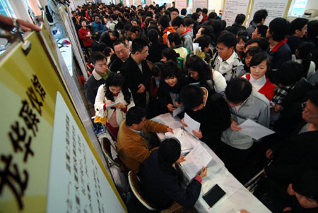 College graduates line up for interviews with funeral companies at a job fair at Shanghai Human Resource Exchange Center, March 21, 2009. Some 23 funeral parlors, cemeteries and undertaking agents offered 395 positions of office and marketing staff, funeral planners, designers and researchers for graduates at this job affair. The average pay is around 3000 yuan (US$439) a month.[Xinhua] |