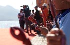 Security staff sit in the goal for security protection as the new Red Lantern Stadium welcomes its first football game in Taiyuan, North China's Shanxi province, Oct 8, 2011. [Photo/CFP]