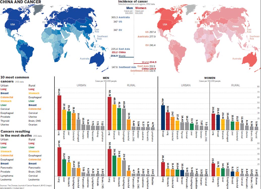 In the past 40 or so years, the rates of incidence of, and deaths from, cancer have been rising in China while falling in many other countries, including Germany, the United States, Australia and Singapore.