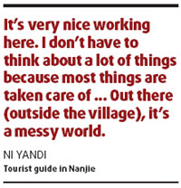 "It's very nice working here. I don't have to think about a lot of things because most things are taken care of," she says. "Out there (outside the village), it's a messy world."