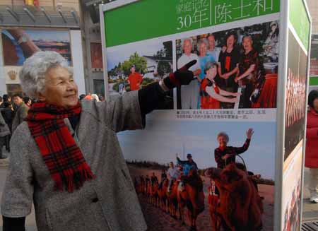 Chen Shihe points herself in a picture at an photo exhibition featuring China's 30 years' reform and opening-up at Wangfujing Street in Beijing, December 16, 2008. The photo exhibition named "30 Years Of Daily Life" is held to mark the 30th anniversary of China's reform initiative. [Xinhua]