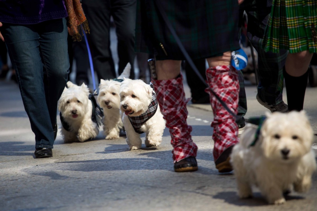 West Highland White Terriers march during the annual Tartan Day Parade in New York, the United States, on April 6, 2019. The parade, which consists of drummers, pipers and dancers, celebrated Scottish and Scottish American heritage. In 1998 the US Senate declared April 6 to be National Tartan Day to recognize the contributions made by Scottish Americans to the United States. [Photo/Xinhua]