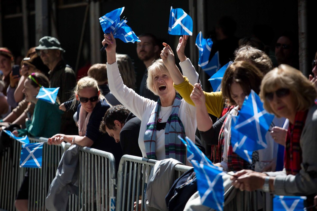 People wave Scottish flags during the annual Tartan Day Parade in New York, the United States, on April 6, 2019. The parade, which consists of drummers, pipers and dancers, celebrated Scottish and Scottish American heritage. In 1998 the US Senate declared April 6 to be National Tartan Day to recognize the contributions made by Scottish Americans to the United States. [Photo/Xinhua]