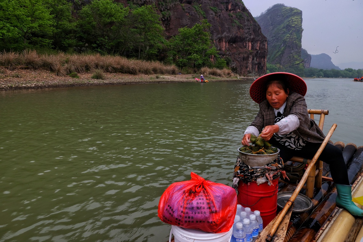 A female vendor prepares food on a bamboo raft by the Luxi River in Yingtan, Jiangxi province on April 13, 2023. [Photo by Jiang Dong/chinadaily.com.cn]
