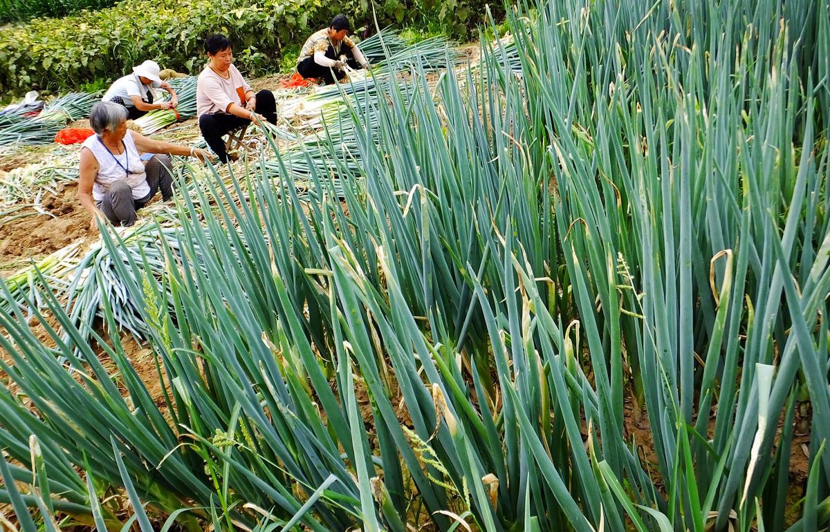 Vegetable farmers harvest Chinese onions in Xinjiang county of Yuncheng, Shanxi province. [Photo by Gao Xinsheng/For chinadaily.com.cn]