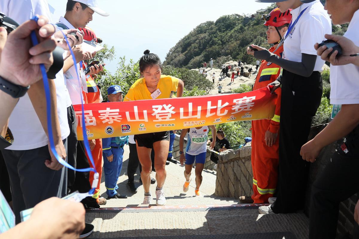 Zhu Bingying from Henan province won the championship in the youth women's group with one hour 14 minutes 44 seconds at the Taishan Mountain climbing race which was held on Wednesday in Tai'an, Shandong province. [Photo by Chen Yang/For chinadaily.com.cn]