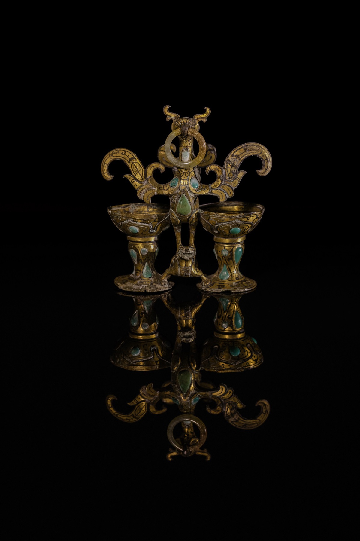 The photo shows Bronze Cup with Decoration of a Scarlet Bird Holding a Ring in Its Beak, one of the exhibited relics at Hebei Museum, in Shijiazhuang, Hebei province. [Photo provided to chinadaily.com.cn]