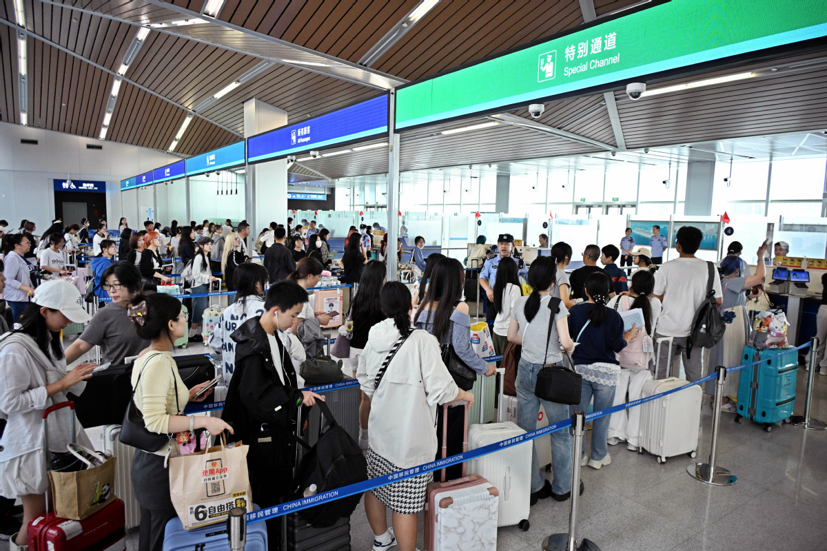Passengers wait in line to go through exit formalities at the Qingdao Cruise Terminal in Qingdao, East China's Shandong province, Oct 1, 2025. [Photo/Xinhua]