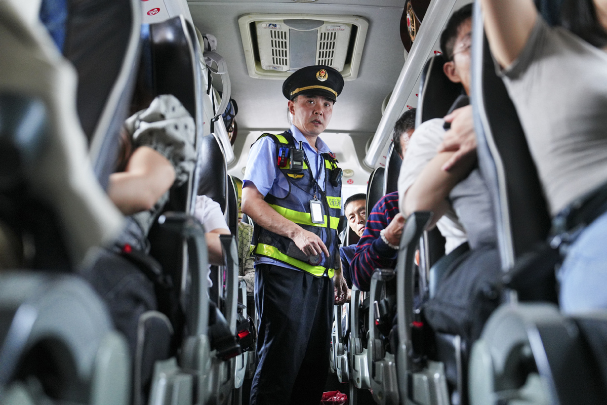A transportation law enforcement officer inspects a bus in Beibei district of Southwest China's Chongqing municipality, Oct 2, 2025. [Photo/Xinhua]