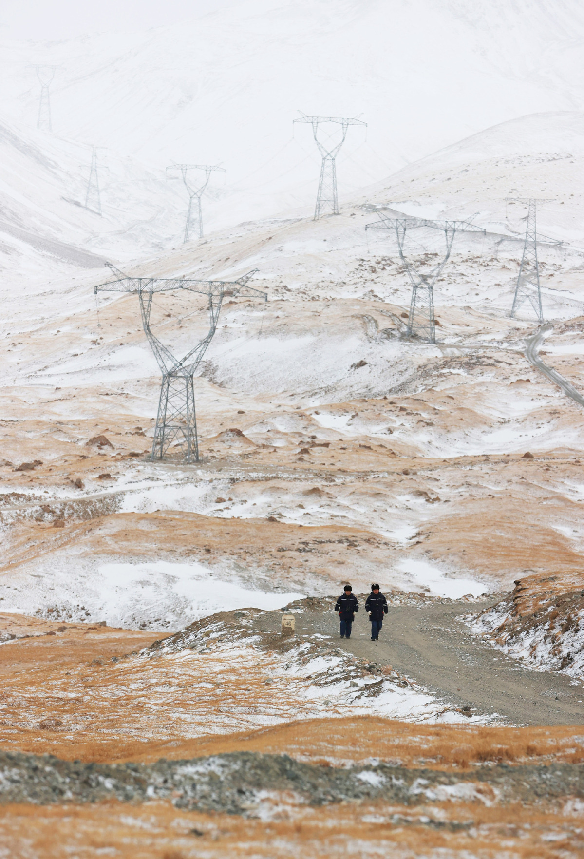 Staff members of a power company patrol along a 750-kilovolt (kV) power transmission line in Hejing county of Mongolian autonomous prefecture of Bayingolin, Northwest China's Xinjiang Uygur autonomous region, Oct 2, 2025. [Photo/Xinhua]