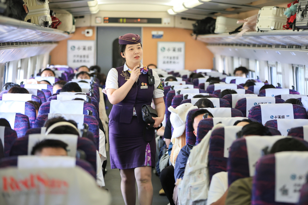 A train attendant works on a train in East China's Jiangsu province, Oct 1, 2025. [Photo/Xinhua]