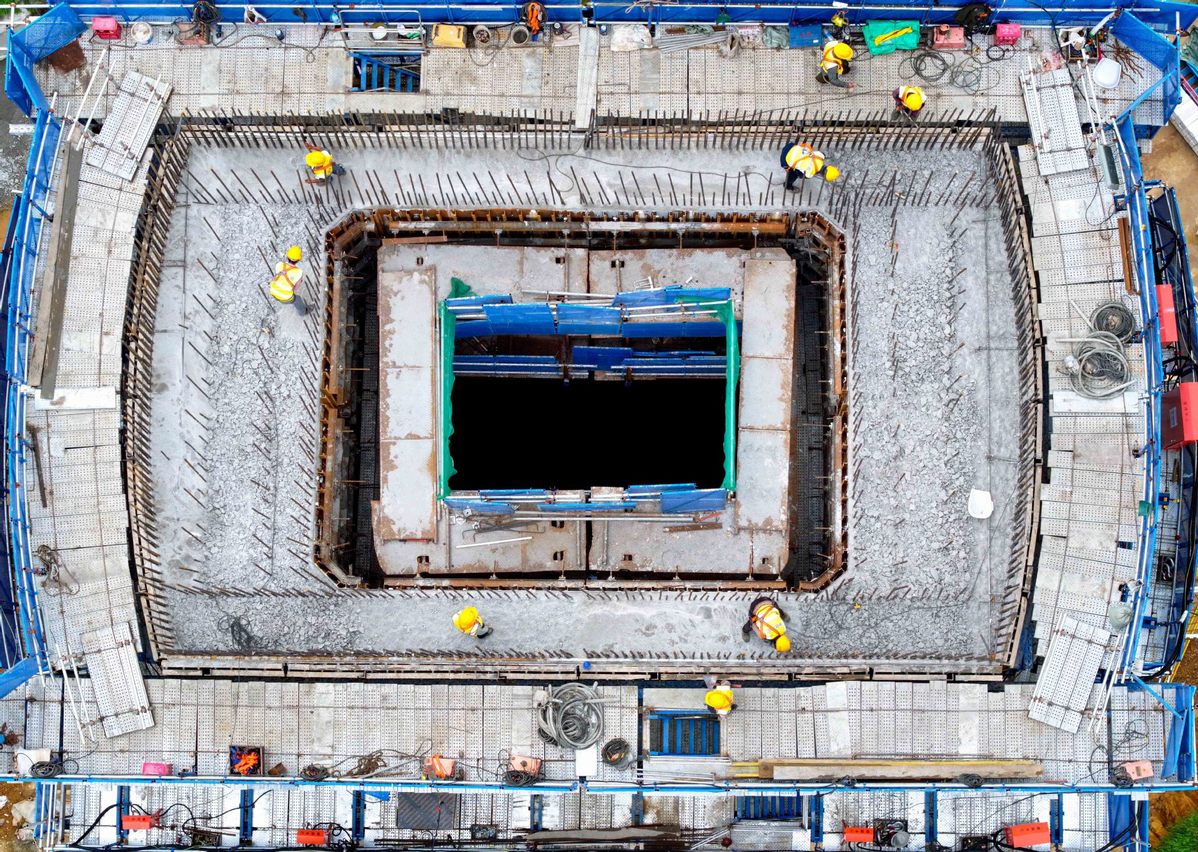 An aerial drone photo taken on Oct 2, 2025 shows workers carrying out tasks at a construction site of a railway bridge in Zhenning county of Southwest China's Guizhou province. [Photo/Xinhua]