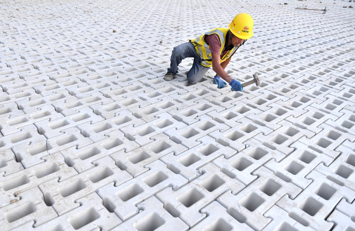 A worker carries out tasks at the construction site of a flood control project in Langfang city, North China's Hebei province, Oct 2, 2025. [Photo/Xinhua]