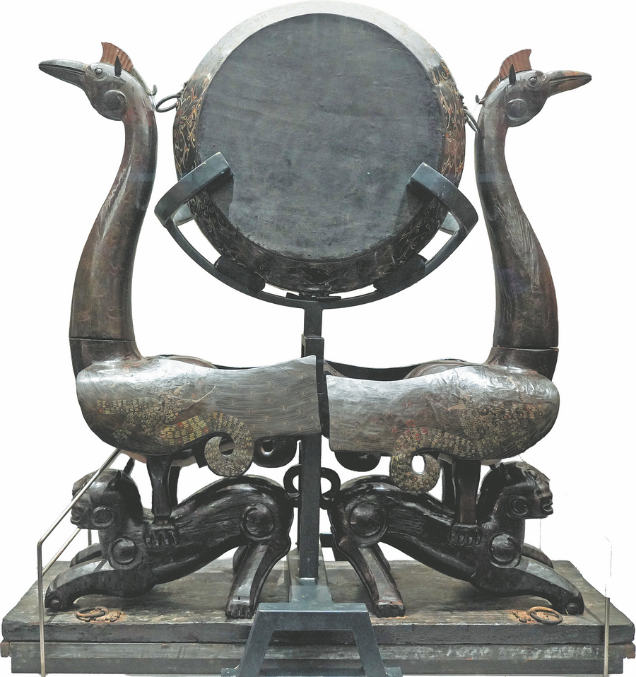A drum of the State of Chu, featuring a lacquered wooden frame made of two phoenixes standing atop tigers. XU LIN/CHINA DAILY
