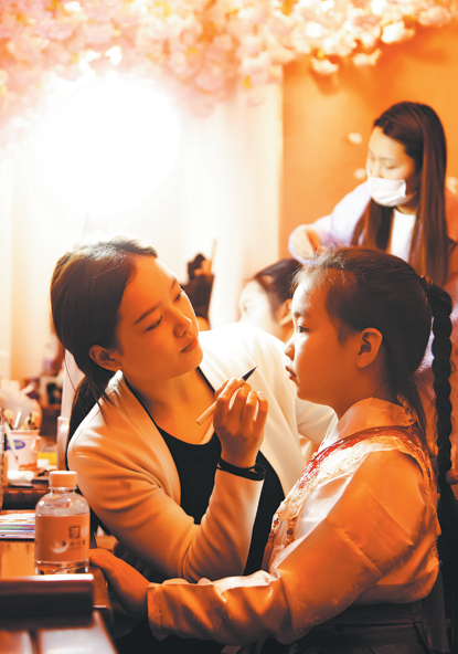 A makeup artist crafts a look for a travel photography client in Taierzhuang, Shandong. [Photo provided to China Daily]