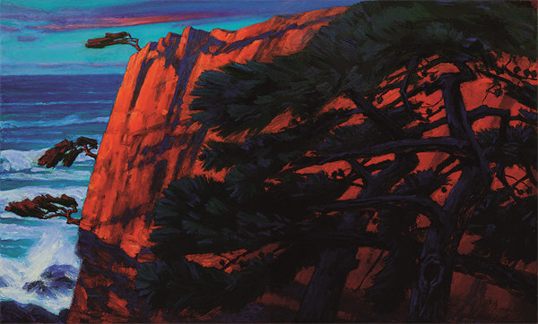 Listening to the Waves: Red Clouds, a large painting by Zhan, is on exhibition. The three-meter-wide piece depicts pine trees growing on the cliff overlooking the sea. Using palette knives to build texture, the artist borrowed from traditional Chinese landscape painting techniques to create a realistic and powerfully symbolic scene. Created in 2013, the painting speaks eloquently about the artist's inner world.