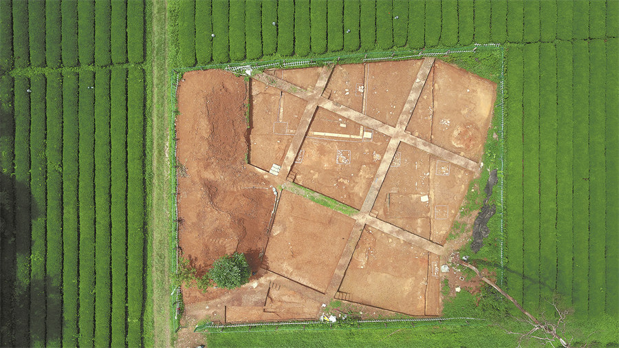 The exposed stone chamber is grand in scale, covering over 100 square meters. Stone boundaries on three sides are clearly visible, while the fourth remains hidden beneath tea fields, awaiting full excavation.