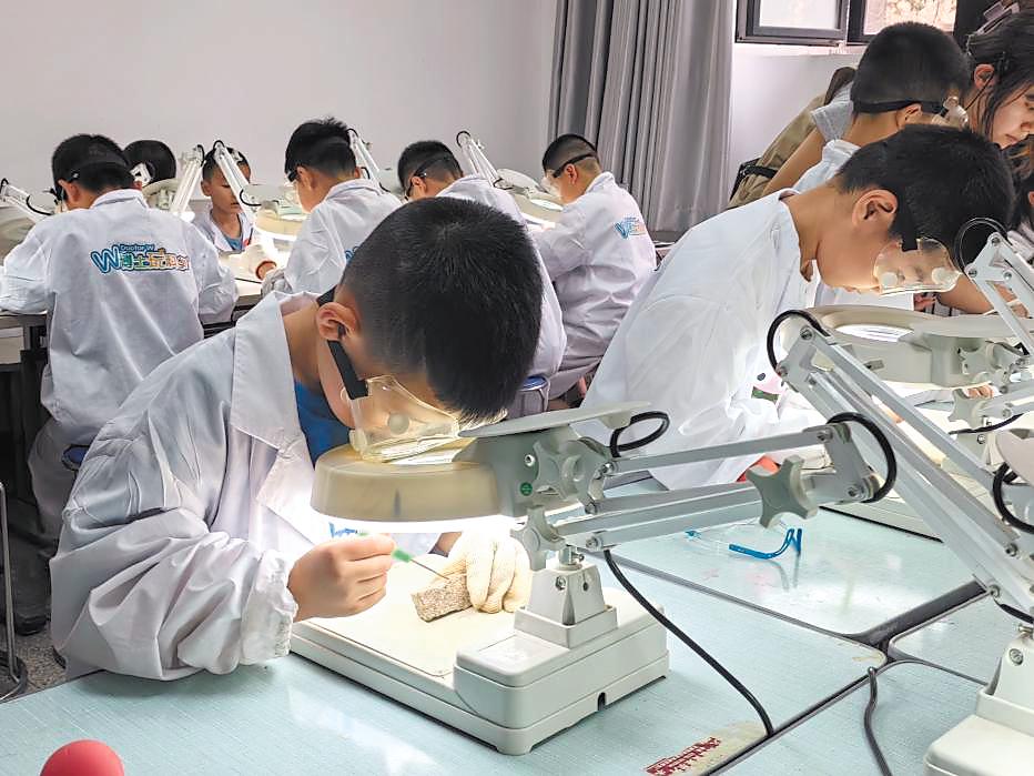 Children take part in a science education activity simulating the daily work of fossil restoration specialists at the Xinjiang Natural Museum. LIU ZIXUAN/FOR CHINA DAILY